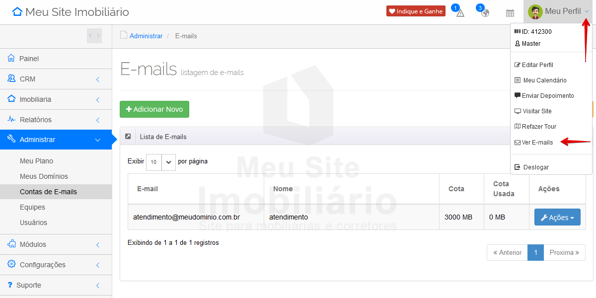 Para acessar o gerenciador de e-mails, acesse o seu painel imobiliário.