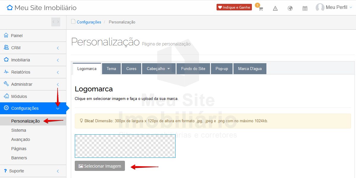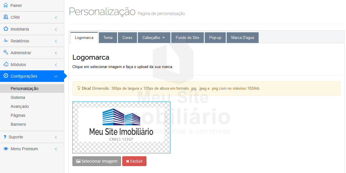 Para adicionar a sua logomarca em seu site, acesse o seu painel imobiliário.