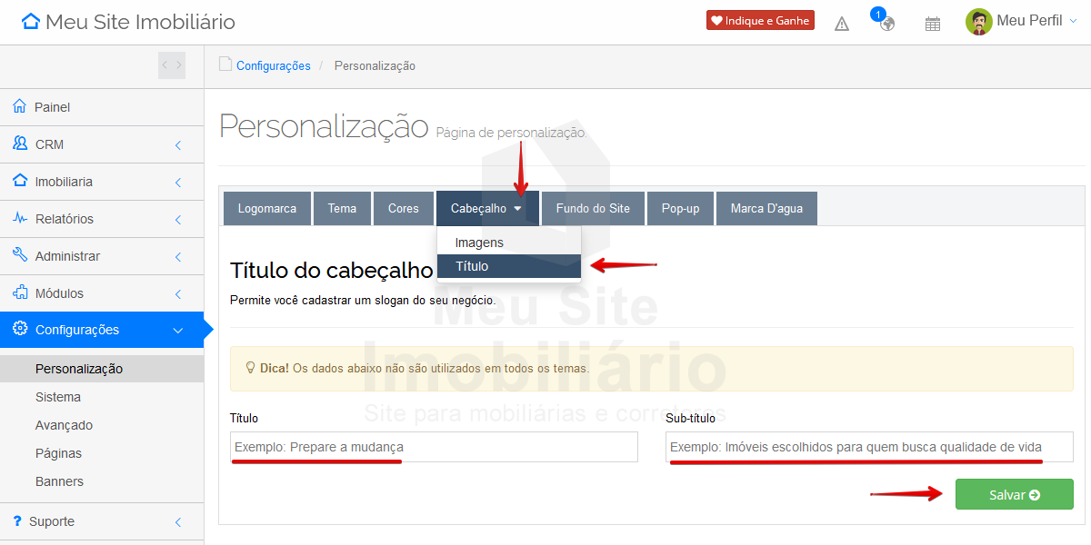 Clique no menu Configurações > Personalização aba Cabeçalho, e escolha a opção Título.