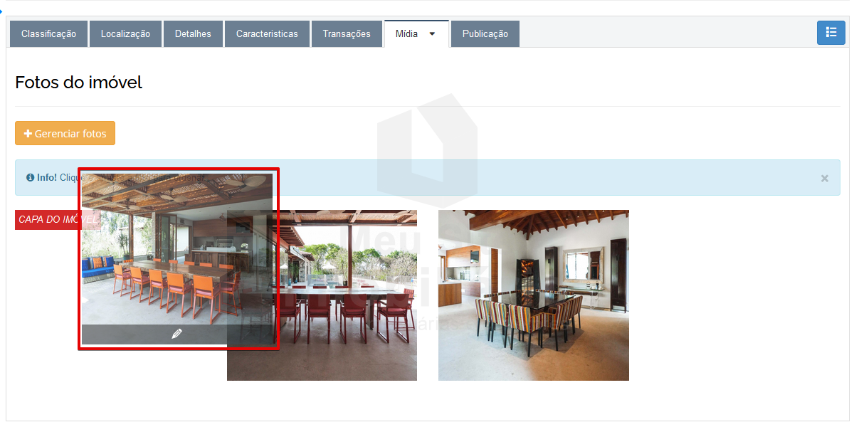 Na tela de edição do imóvel. clique na aba Mídia opção Fotos.