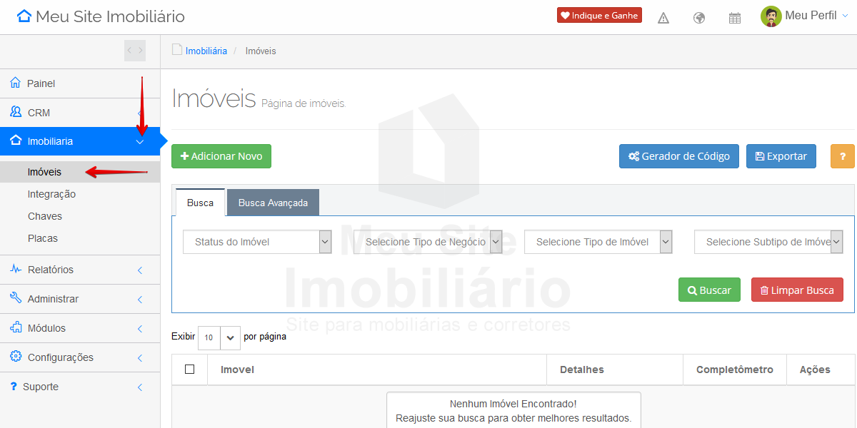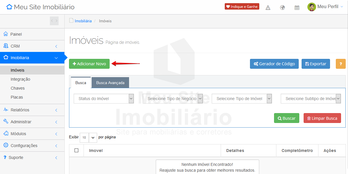 Para iniciar o cadastro do seu imóvel clique no botão Adicionar Novo.