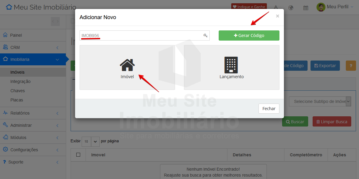 O campo código do imóvel é obrigatório, clique no botão Gerar código e escolha a opção Imóvel para continuar com o cadastro do imóvel.