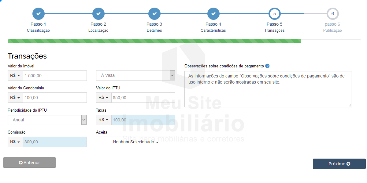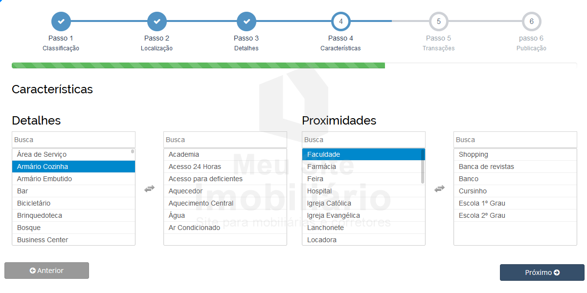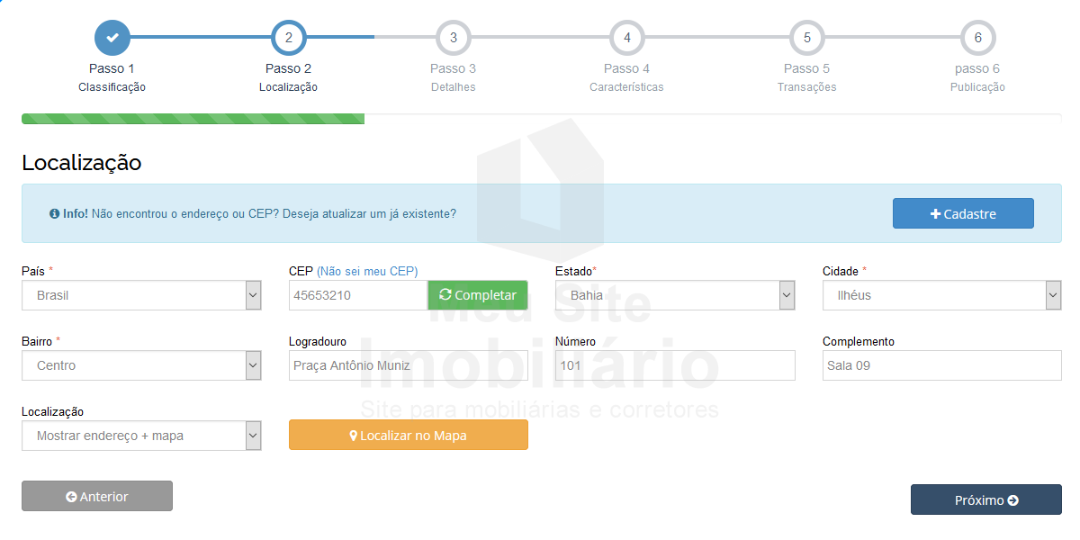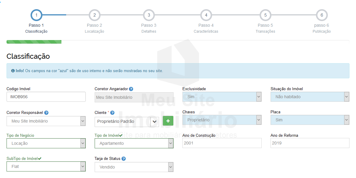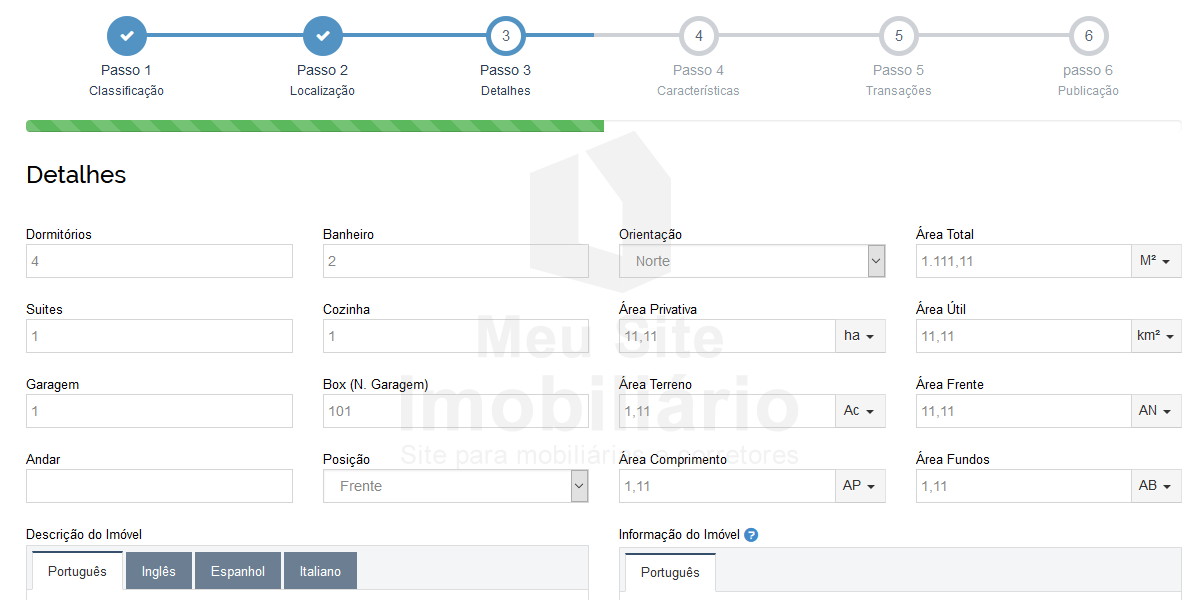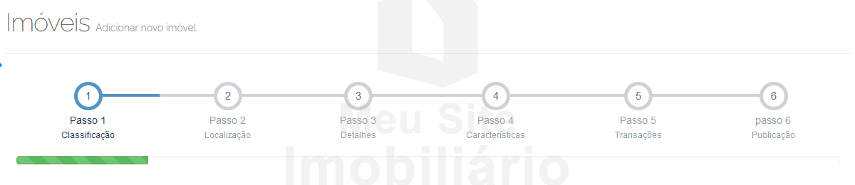 O cadastro do imóvel é dividido em 6 partes: Classificação – Localização – Detalhes – Características – Transações e Publicação.