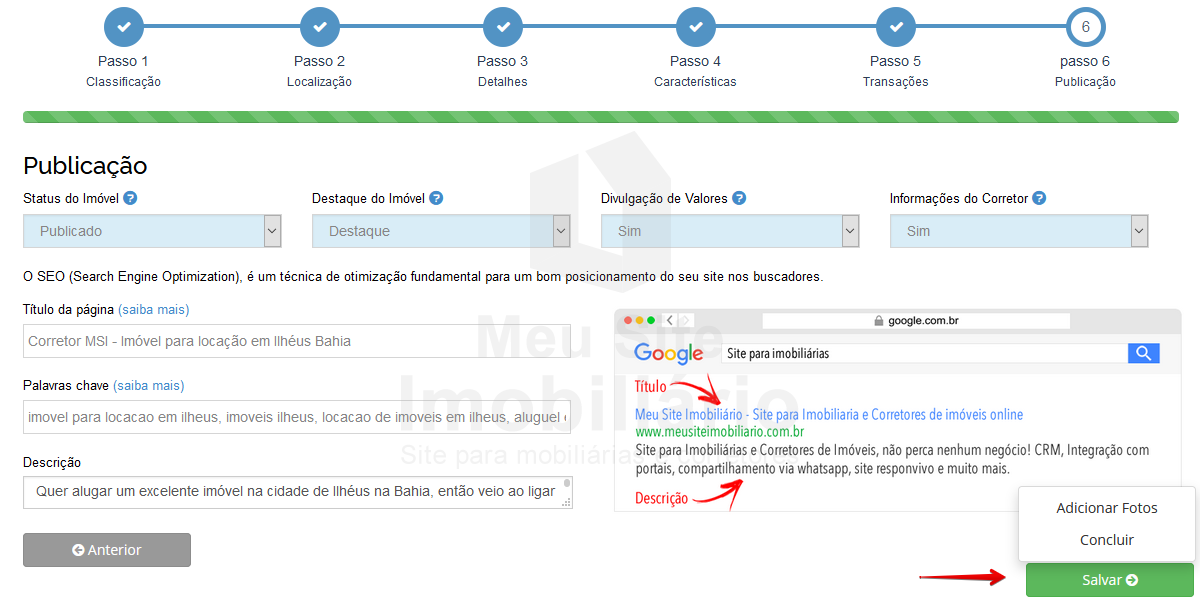 Depois de cadastrar os dados do seu imóvel, clique no botão Salvar e escolha entre Concluir o cadastro ou Adicionar Fotos.