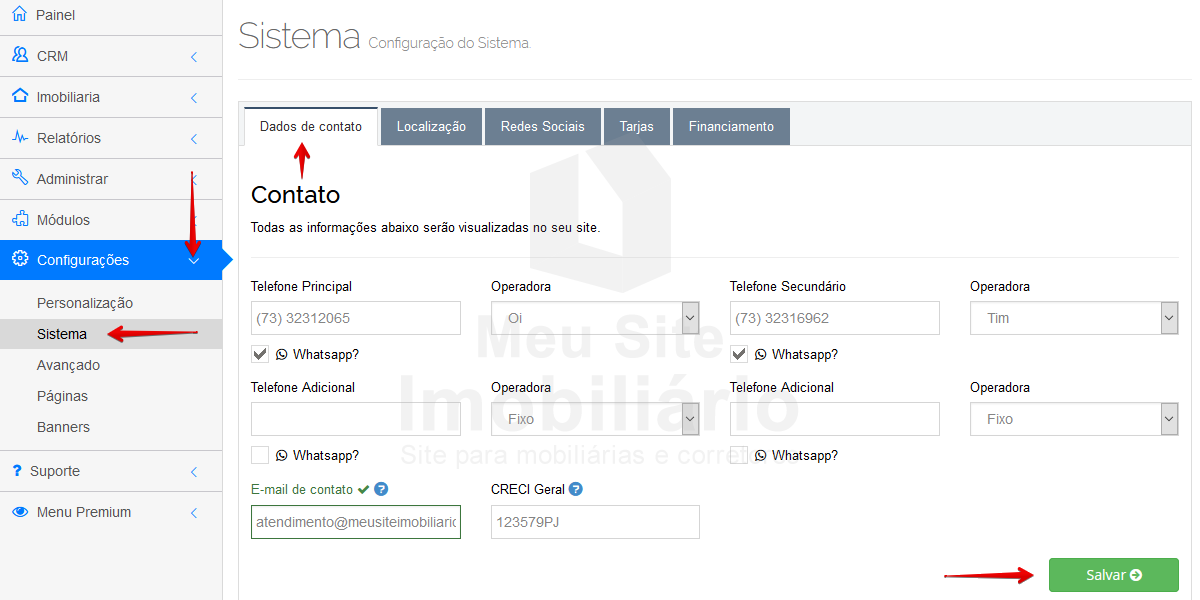 Clique no menu Configurações > Sistema aba Dados de contato.