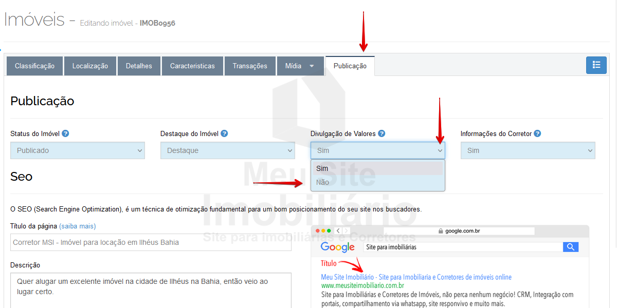 Na tela de cadastro/edição do imóvel, clique na aba Publicação campo Divulgação de Valores.