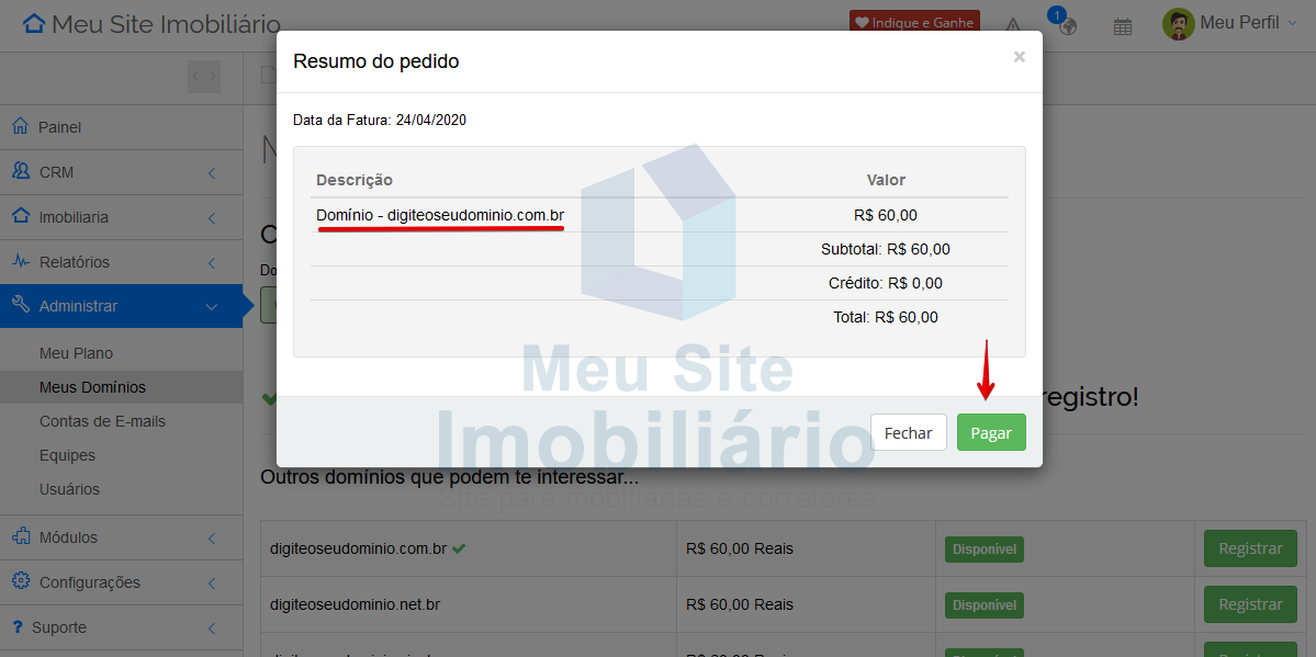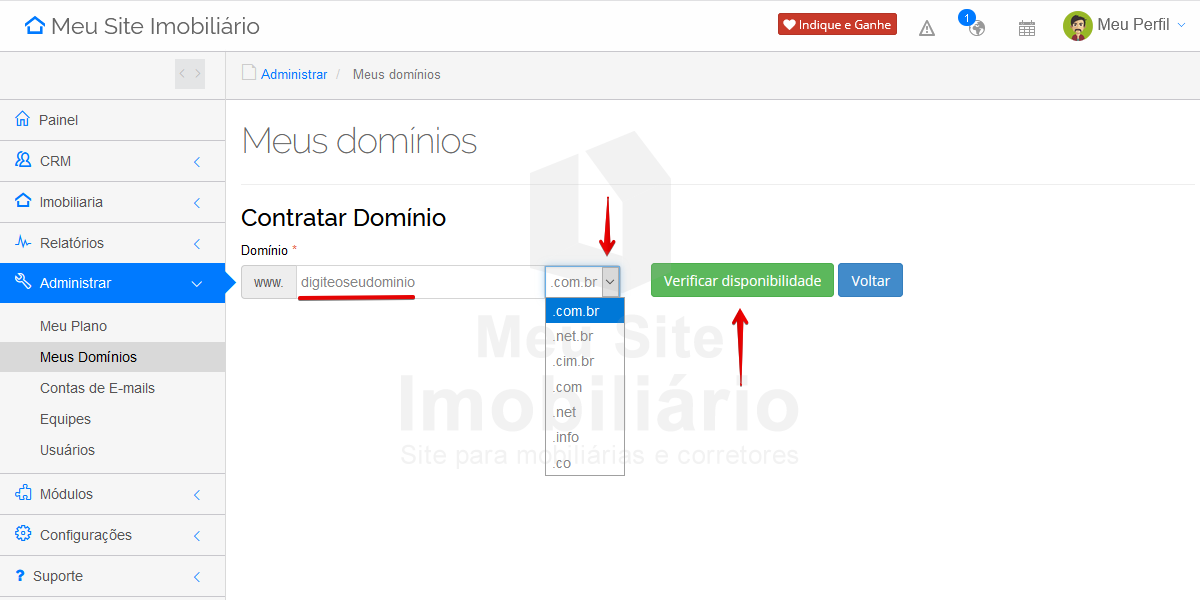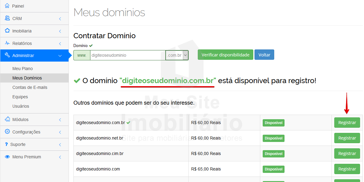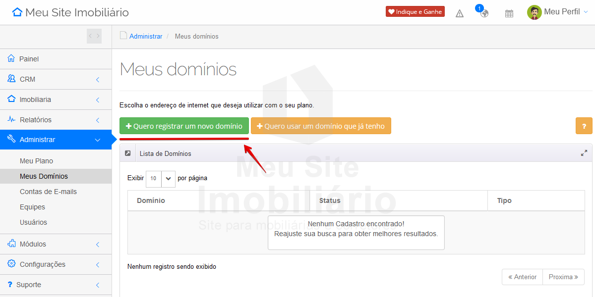 Você pode registrar um domínio no Meu Site Imobiliário em poucos passos. Para começar, no seu Painel Imobiliário, acesse o meu Administrar > Meus Domínios.