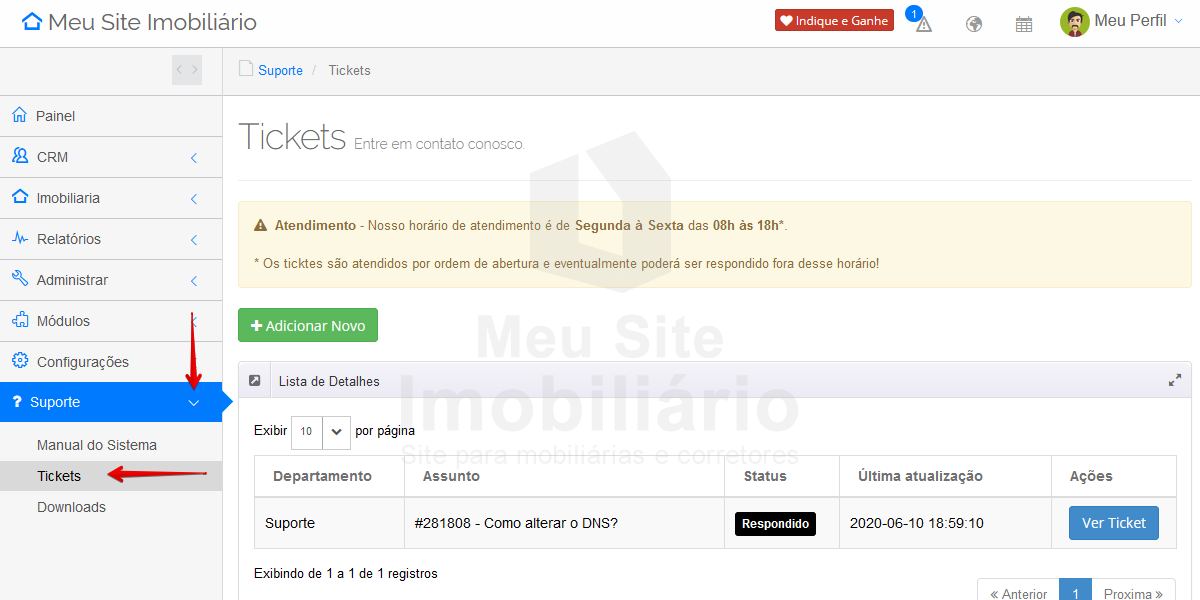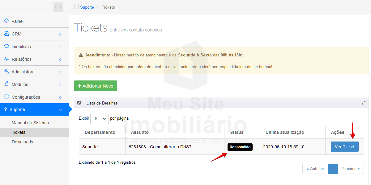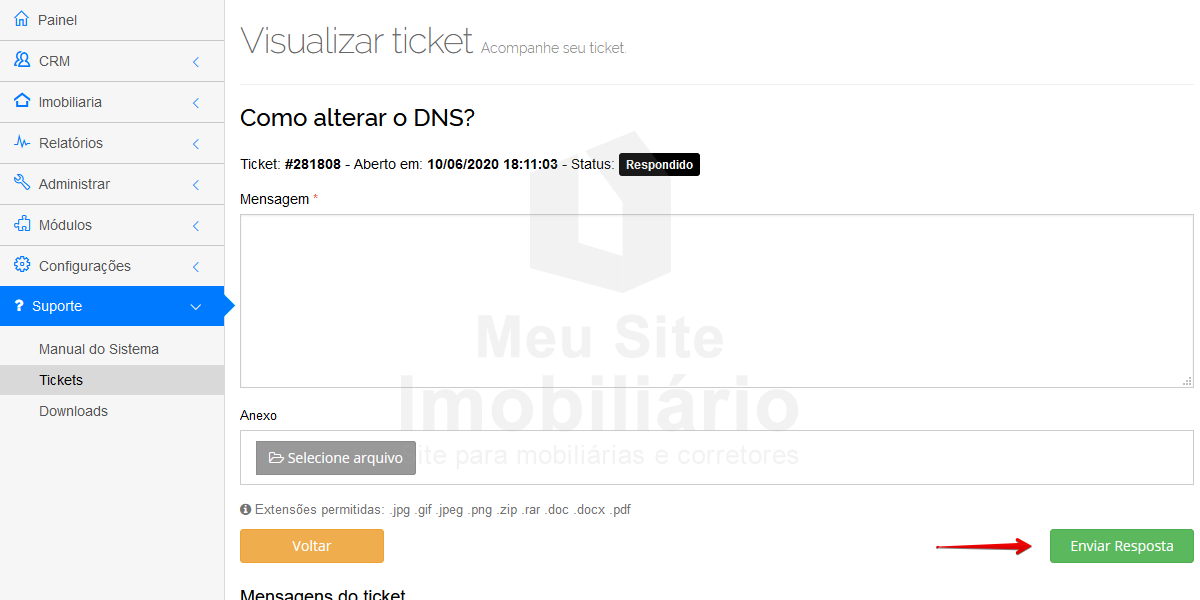 Para verificar e responder o ticket de suporte, acesse o seu painel imobiliário.