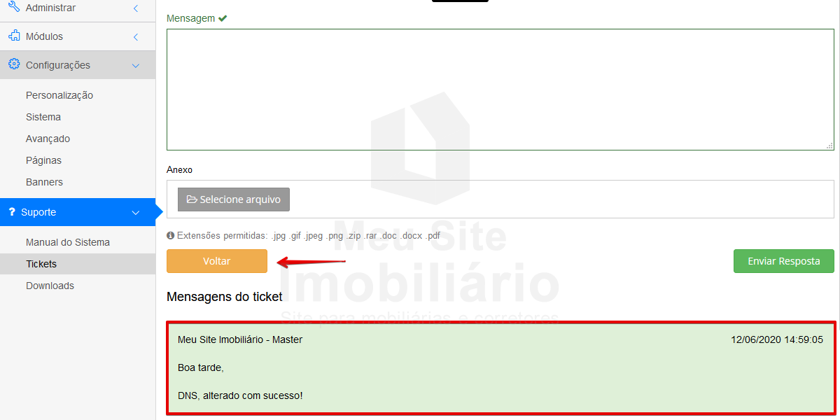 Ticket respondido com sucesso, sua resposta será mostrada na cor verde. Para sair dessa tela e ver a lista de tickets clique no botão Voltar.