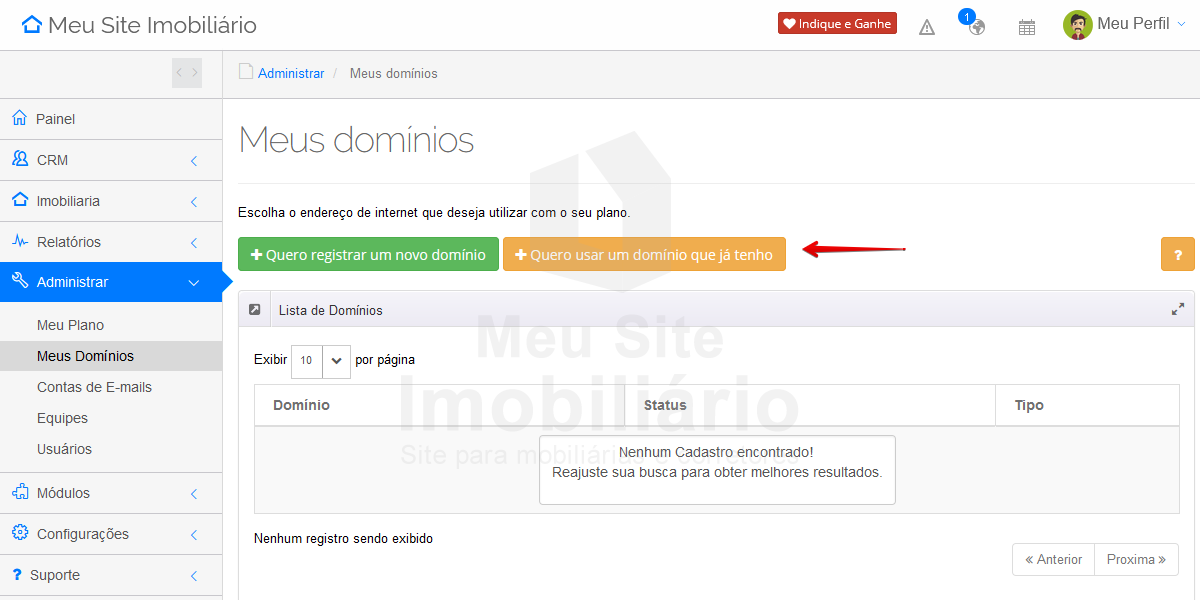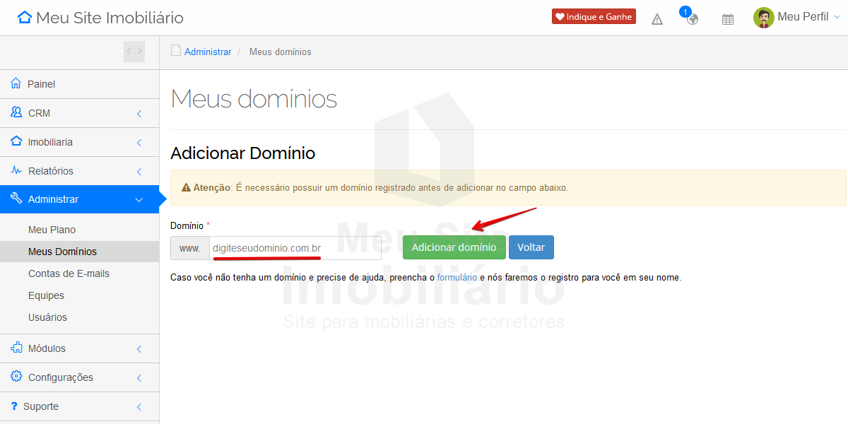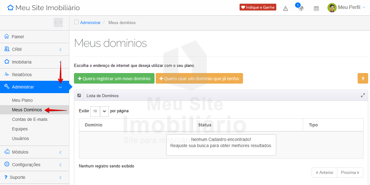 No seu painel imobiliário, acesse o menu Administrar > Meus domínios.